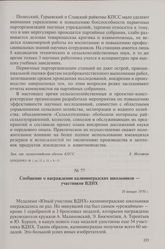 Сообщение о награждении калининградских школьников — участников ВДНХ. 10 января 1970 г. // Калининградская правда. — 1970. — 10 января.