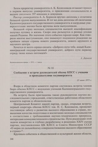 Сообщение о встрече руководителей обкома КПСС с учеными и преподавателями госуниверситета. 21 июня 1973 г. // Калининградская правда. — 1973. — 22 июня.
