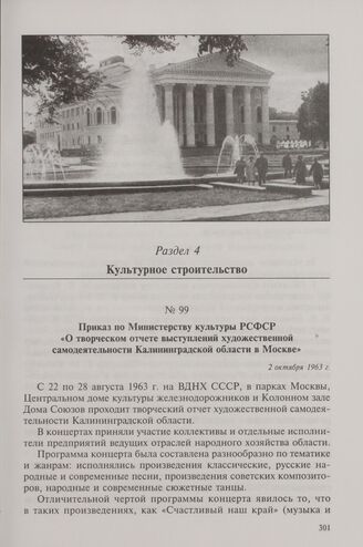 Приказ по Министерству культуры РСФСР «О творческом отчете выступлений художественной самодеятельности Калининградской области в Москве». 2 октября 1963 г.
