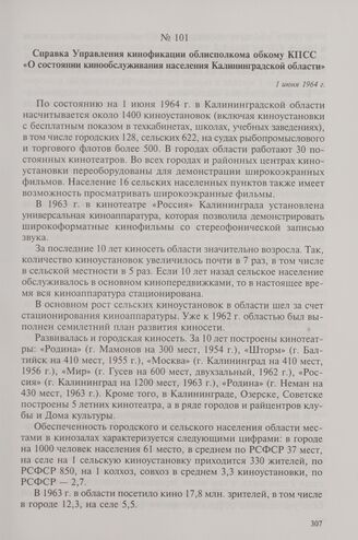 Справка Управления кинофикации облисполкома обкому КПСС «О состоянии кинообслуживания населения Калининградской области». 1 июня 1964 г.