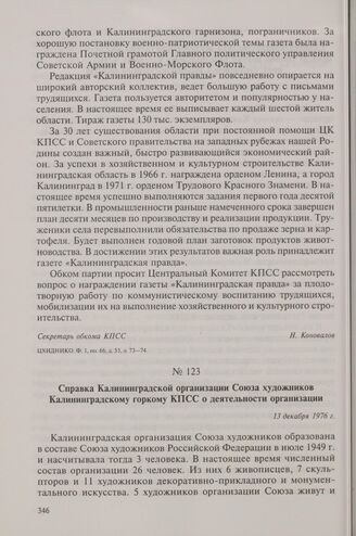 Справка Калининградской организации Союза художников Калининградскому горкому КПСС о деятельности организации. 13 декабря 1976 г.