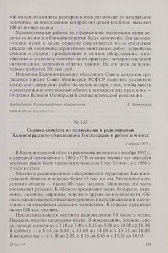 Справка комитета по телевидению и радиовещанию Калининградского облисполкома Гостелерадио о работе комитета. 5 апреля 1977 г.