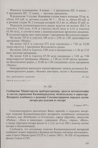 Сообщение Министерства приборостроения, средств автоматизации и систем управления Калининградскому облисполкому и директору Янтарного комбината о решении Союзювелирпрома передать музею янтаря ряд изделий из янтаря. 8 апреля 1977 г. // ГАКО. Ф. 297, оп. 10, д. 119, л. 4.