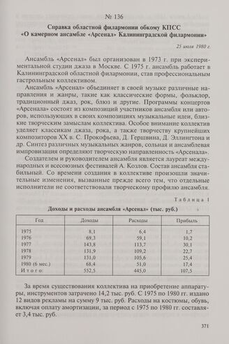 Справка областной филармонии обкому КПСС «О камерном ансамбле «Арсенал» Калининградской филармонии». 25 июля 1980 г. // ЦХИДНИКО. Ф. 1, оп. 107, д. 134, л. 6-8.