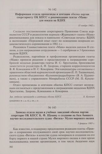 Информация отдела пропаганды и агитации обкома партии секретариату ОК КПСС о рекомендации газеты «Маяк» для показа на ВДНХ. 15 ноября 1982 г.