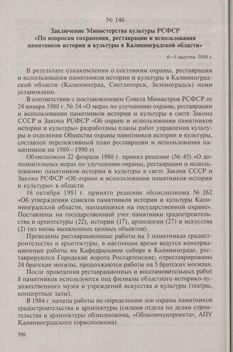 Заключение Министерства культуры РСФСР «По вопросам сохранения, реставрации и использования памятников истории и культуры в Калининградской области». 6-9 августа 1984 г.