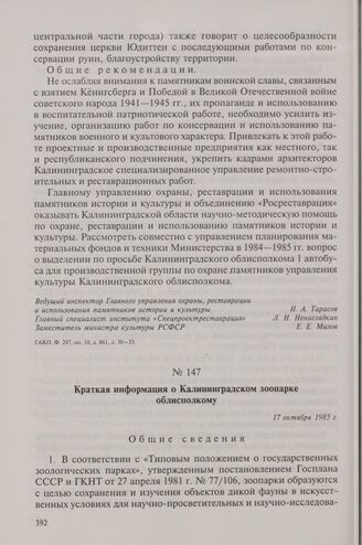 Краткая информация о Калининградском зоопарке облисполкому. 17 октября 1985 г. // ГАКО. Ф. 297, оп. 1, д. 993, л. 23-28.