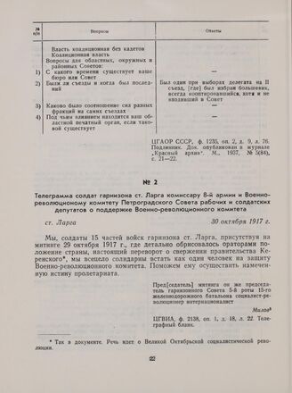 Телеграмма солдат гарнизона ст. Ларга комиссару 8-й армии и Военно-революционому комитету Петроградского Совета рабочих и солдатских депутатов о поддержке Военно-революционного комитета. Ст. Ларга 30 октября 1917 г.