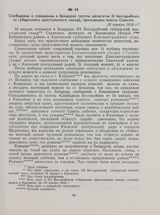 Сообщение о совещании в Бендерах группы делегатов III Бессарабского губернского крестьянского съезда, признавшем власть Советов. 18 января 1918 г. // «Голос революции», № 158, 1918, 24 января. Док. опубликован в сб.: Борьба трудящихся Молдавии против интервентов и внутренней контрреволюции в 1917—1920 гг., док. № 59, с. 74—75.