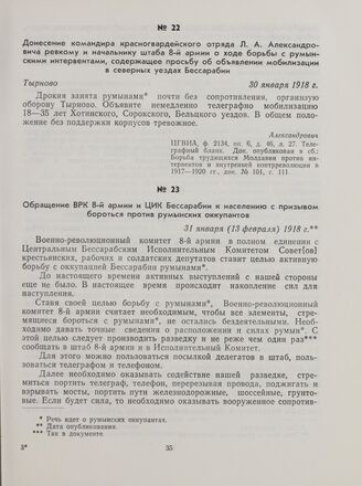 Обращение ВРК 8-й армии и ЦИК Бессарабии к населению с призывом бороться против румынских оккупантов. 31 января (13 февраля) 1918 г. // «Известия Совета солдатских депутатов 8-й армии», № 4, 1918, 31 января (13 февраля). Док. опубликован в сб.: Борьба трудящихся Молдавии против интервентов и внутренней контрреволюции в 1917—1920 гг., док. № 103, с. 112.