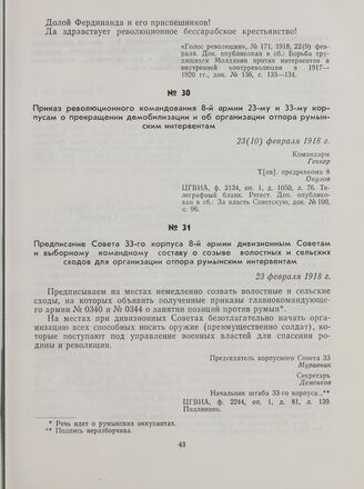 Предписание Совета 33-го корпуса 8-й армии дивизионным Советам и выборному командному составу о созыве волостных и сельских сходов для организации отпора румынским интервентам. 23 февраля 1918 г.