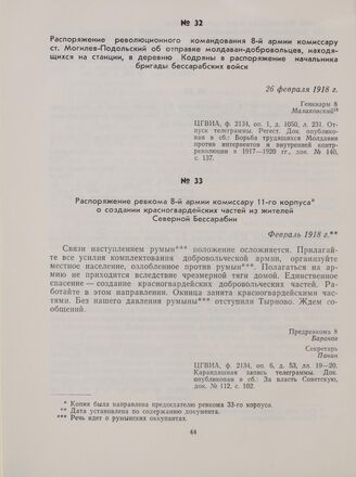 Распоряжение ревкома 8-й армии комиссару 11-го корпуса о создании красногвардейских частей из жителей Северной Бессарабии. Февраль 1918 г. // ЦГВИА, ф. 2134, оп. 6, д. 53, лл. 19—20. Карандашная запись телеграммы. Док. опубликован в сб.: За власть Советскую, док. № 112, с. 102.