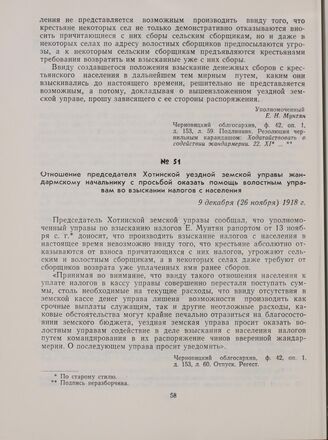 Отношение председателя Хотинской уездной земской управы жандармскому начальнику с просьбой оказать помощь волостным управам во взыскании налогов с населения. 9 декабря (26 ноября) 1918 г. // Черновицкий облгосархив, ф. 42, оп. 1, д. 153, л. 60. Отпуск. Регест.