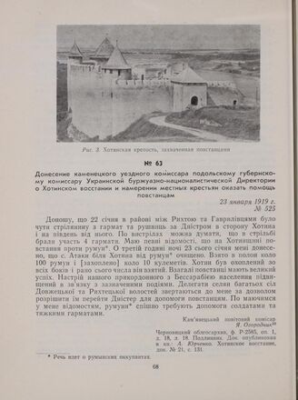 Донесение каменецкого уездного комиссара подольскому губернскому комиссару Украинской буржуазно-националистической Директории о Хотинском восстании и намерении местных крестьян оказать помощь повстанцам. 23 января 1919 г. // Черновицкий облгосархив, ф. Р-2585, оп. 1, д. 18, л. 18. Подлинник. Док. опубликован в кн.: А. Юрченко. Хотинское восстание, док. № 21, с. 131.