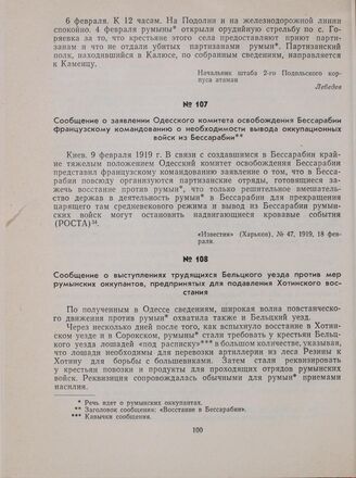 Сообщение о выступлениях трудящихся Бельцкого уезда против мер румынских оккупантов, предпринятых для подавления Хотинского восстания // «Бюллетень Бессарабского бюро печати», № 28, 1919, 10 февраля.