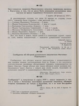 Удостоверение, выданное Ворничанским сельским правлением жителям с. Ворничаны, о том, что их дома были разрушены румынскими оккупантами во время подавления Хотинского восстания. 5 марта (20 февраля) 1919 г. // Черновицкий облгосархив, ф. 42, оп. 1, д. 153, л. 200. Заверенная копия. Регест.
