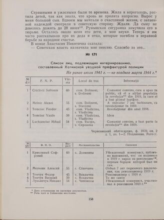 Список лиц, подлежащих интернированию, составленный Хотинской уездной префектурой полиции. Не ранее июля 1941 г. — не позднее марта 1944 г. // Черновицкий облгосархив, ф. 1039, оп. 2, д. 1, лл. 1—2. Подлинник. Регест.