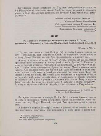 Из заявления участницы Хотинского восстания Е. Лазар, уроженки с. Шировцы, в Каменец-Подольскую партизанскую комиссию. 30 марта 1931 г. // Хмельницкий облгосархив, ф. Р-3222, оп. 1, д. 58, лл. 3—5. Подлинник.