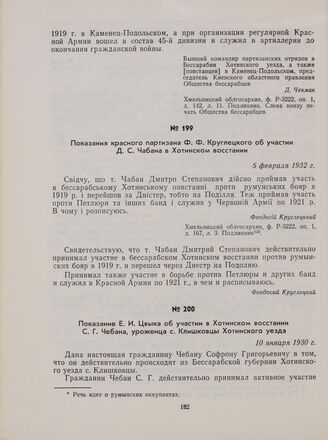 Показания красного партизана Ф. Ф. Круглецкого об участии Д. С. Чабана в Хотинском восстании. 5 февраля 1932 г. // Хмельницкий облгосархив, ф. Р-3222, оп. 1, д. 167, л. 3. Подлинник.