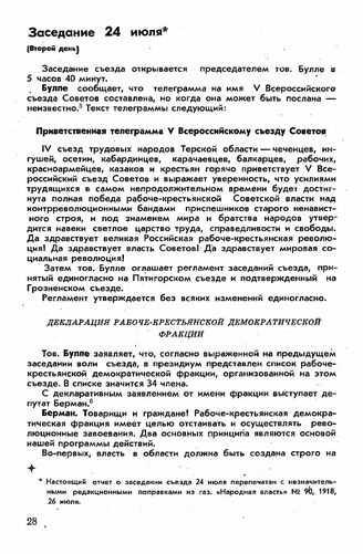 Четвертый съезд, Владикавказ, 23 июля-21 августа 1918 г. Заседание 24 июля (Второй день) // Газ. «Народная власть» № 90, 1918, 26 июля.