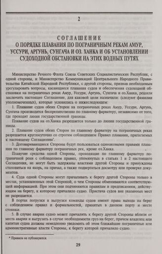 Соглашение о порядке плавания по пограничным рекам Амур, Уссури, Аргунь, Сунгача и оз. Ханка и об установлении судоходной обстановки на этих водных путях. Г. Харбин, 2 января 1951 года