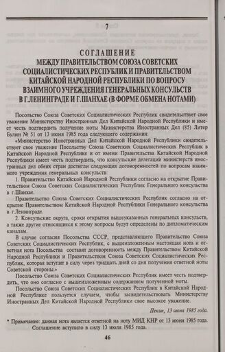 Соглашение между Правительством Союза Советских Социалистических Республик и Правительством Китайской Народной Республики по вопросу взаимного учреждения генеральных консульств в г. Ленинграде и г. Шанхае (в форме обмена нотами). Пекин, 13 июня 1985 года