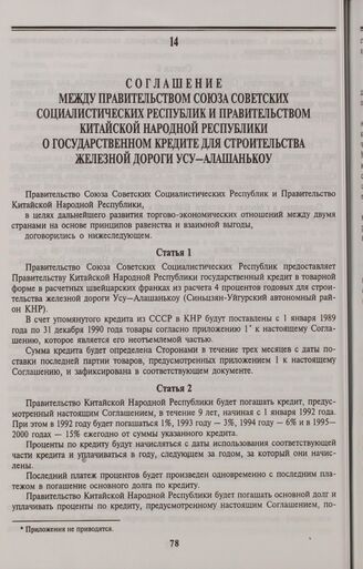 Соглашение между Правительством Союза Советских Социалистических Республик и Правительством Китайской Народной Республики о государственном кредите для строительства железной дороги Усу — Алашанькоу. Москва, 28 декабря 1988 года