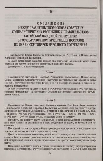 Соглашение между Правительством Союза Советских Социалистических Республик и Правительством Китайской Народной Республики о государственном кредите для поставок из КНР в СССР товаров народного потребления. Москва, 24 апреля 1990 года