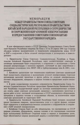 Меморандум между Правительством Союза Советских Социалистических Республик и Правительством Китайской Народной Республики о сотрудничестве в сооружении в КНР атомной электростанции и предоставлении Советским Союзом Китаю государственного кредита. ...