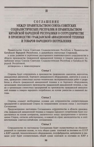 Соглашение между Правительством Союза Советских Социалистических Республик и Правительством Китайской Народной Республики о сотрудничестве в производстве гражданской авиационной техники и товаров народного потребления. Москва, 14 июня 1990 г.