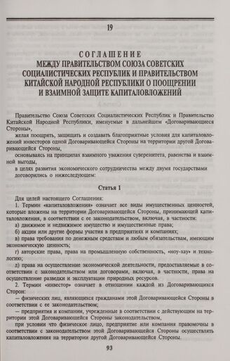 Соглашение между Правительством Союза Советских Социалистических Республик и Правительством Китайской Народной Республики о поощрении и взаимной защите капиталовложений. Пекин, 21 июля 1990 г.