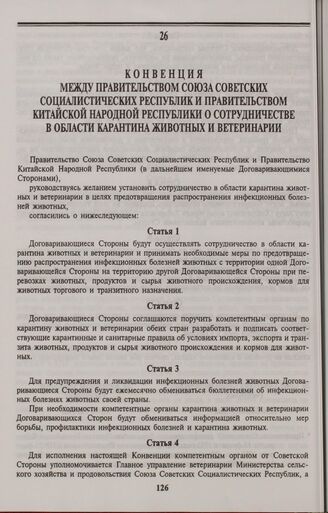 Конвенция между Правительством Союза Советских Социалистических Республик и Правительством Китайской Народной Республики о сотрудничестве в области карантина животных и ветеринарии. Москва, 7 июня 1991 года