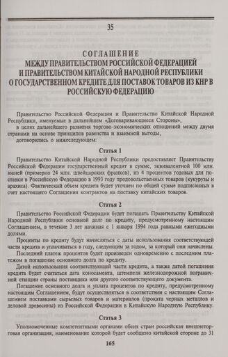 Соглашение между Правительством Российской Федерацией и Правительством Китайской Народной Республики о государственном кредите для поставок товаров из КНР в Российскую Федерацию. Пекин, 18 декабря 1992 года