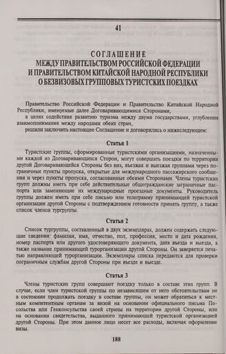 Соглашение между Правительством Российской Федерации и Правительством Китайской Народной Республики о безвизовых групповых туристских поездках. Пекин, 18 декабря 1992 года