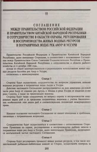 Соглашение между Правительством Российской Федерации и Правительством Китайской Народной Республики о сотрудничестве в области охраны, регулирования и воспроизводства живых водных ресурсов в пограничных водах рек Амур и Уссури. Пекин, 27 мая 1994 ...
