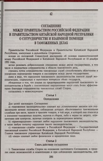Соглашение между Правительством Российской Федерации и Правительством Китайской Народной Республики о сотрудничестве и взаимной помощи в таможенных делах. Москва, 3 сентября 1994 года