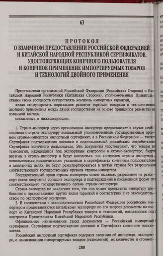 Протокол о взаимном предоставлении Российской Федерацией и Китайской Народной Республикой сертификатов, удостоверяющих конечного пользователя и конечное применение импортируемых товаров и технологий двойного применения. Пекин, 2 декабря 1994 года