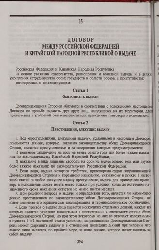 Договор между Российской Федерацией и Китайской Народной Республикой о выдаче. Москва, 26 июня 1995 г.