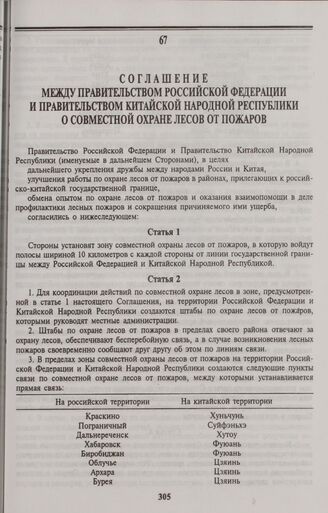 Соглашение между Правительством Российской Федерации и Правительством Китайской Народной Республики о совместной охране лесов от пожаров. Москва, 26 июня 1995 г.