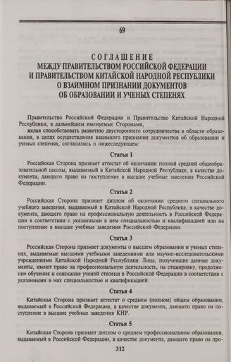Соглашение между Правительством Российской Федерации и Правительством Китайской Народной Республики о взаимном признании документов об образовании и ученых степенях. Москва, 26 июня 1995 г.