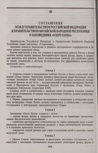 Соглашение между Правительством Российской Федерации и Правительством Китайской Народной Республики о заповеднике «Озеро Ханка». Пекин, 25 апреля 1996 года