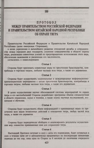 Протокол между Правительством Российской Федерации и Правительством Китайской Народной Республики об охране тигра. Пекин, 10 ноября 1997 г.