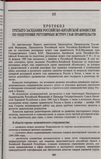 Главная Сборник российско-китайских договоров. 1949-1999 гг. Протокол третьего заседания Российско-Китайской Комиссии по подгото...