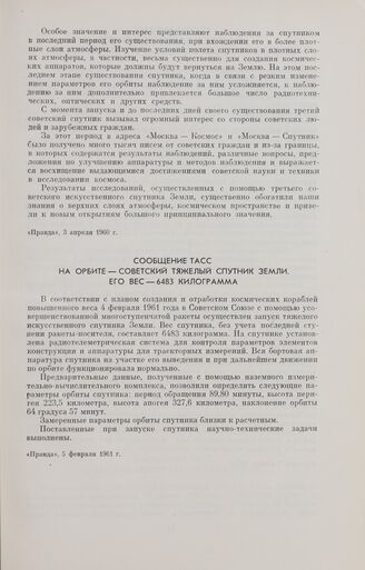 Сообщение ТАСС. На орбите — советский тяжелый спутник Земли. Его вес — 6483 килограмма // «Правда», 5 февраля 1961 г.