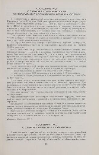Сообщение ТАСС о запуске в Советском Союзе маневрирующего космического аппарата «Полет-2» // «Правда», 13 апреля 1964 г.