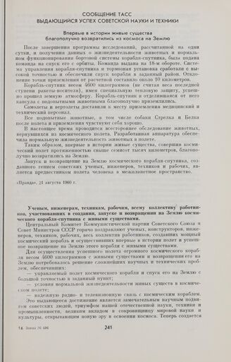 Сообщение ТАСС. Выдающийся успех советской науки и техники. Впервые в истории живые существа благополучно возвратились из космоса на Землю