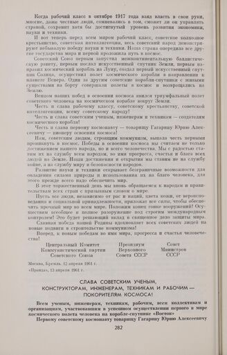 Слава советским ученым, конструкторам, инженерам, техникам и рабочим — покорителям космоса! // «Правда», 13 апреля 1961 г.