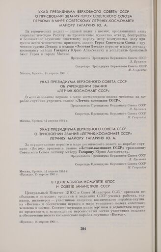Указ Президиума Верховного Совета СССР о присвоении звания Героя Советского Союза первому в мире советскому летчику-космонавту майору Гагарину Ю.А. // «Правда», 15 апреля 1961 г.