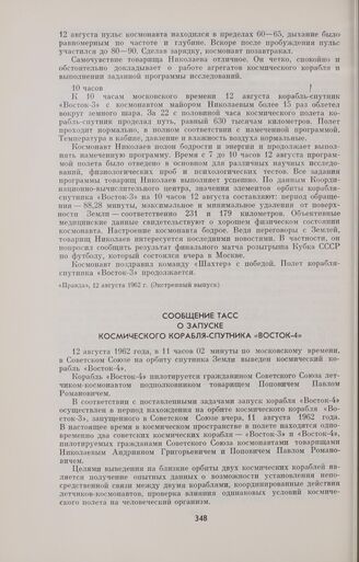 Сообщение ТАСС о запуске космического корабля-спутника «Восток-4» // «Правда», 12 августа 1962 г. (Экстренный выпуск).