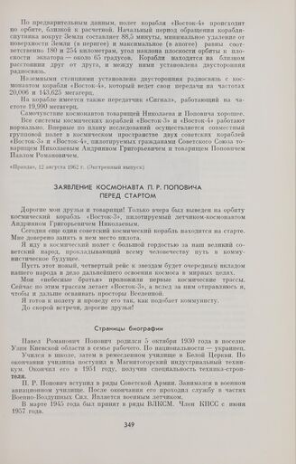 Заявление космонавта П.Р. Поповича перед стартом // «Правда», 12 августа 1962 г. (Экстренный выпуск).